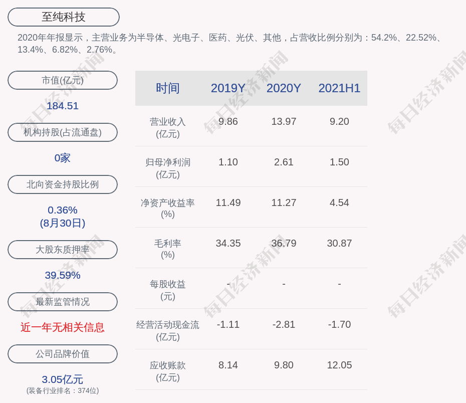 2020年年报显示,至纯科技的主营业务为半导体、光电子、医药、光伏、其他,占营收比例分别为:54.2%、22.52%、13.4%、6.82%、2.76%。