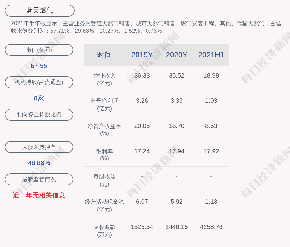 2021年半年报显示,蓝天燃气的主营业务为管道天然气销售、城市天然气销售、燃气安装工程、其他、代输天然气,占营收比例分别为:57.71%、29.68%、10.27%、1.52%、0.76%。