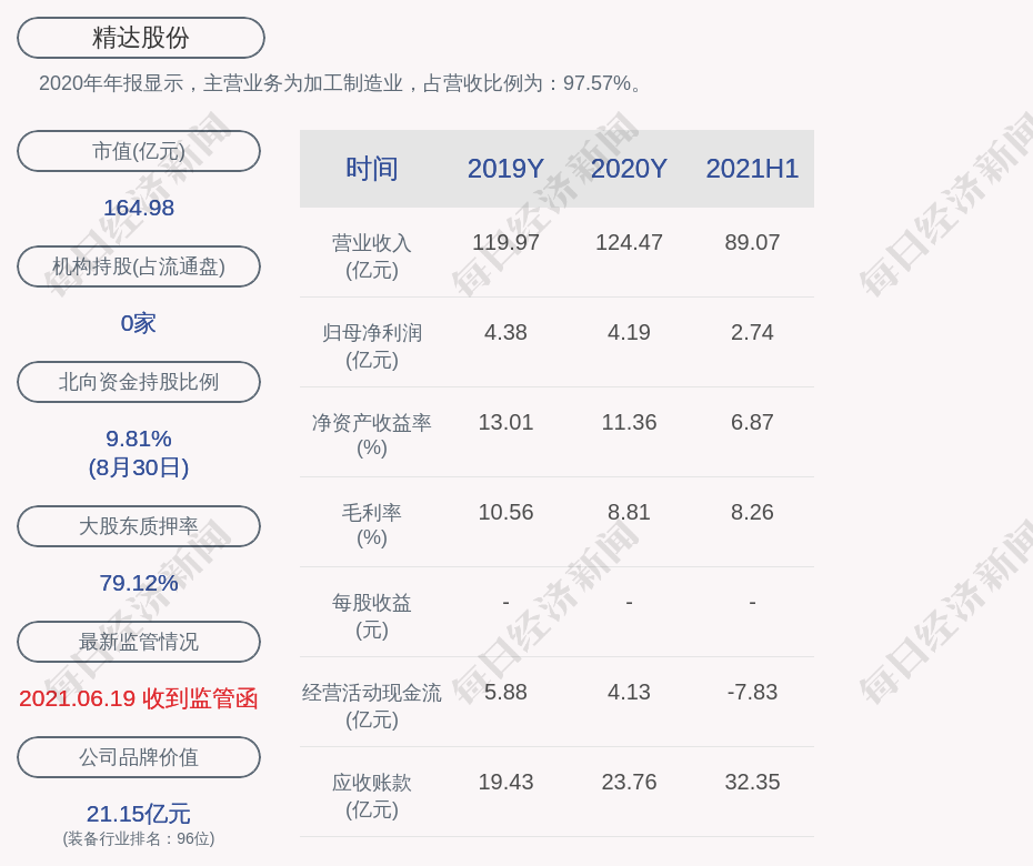 2020年年报显示,精达股份的主营业务为加工制造业,占营收比例为:97.57%。