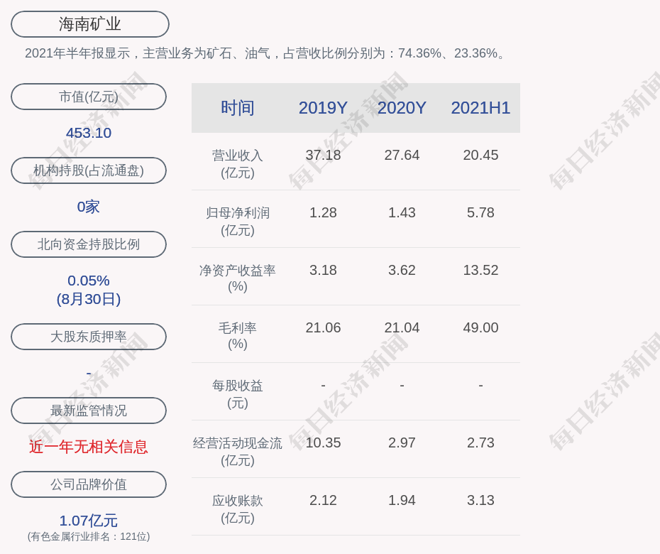 2021年半年报显示,海南矿业的主营业务为矿石、油气,占营收比例分别为:74.36%、23.36%。