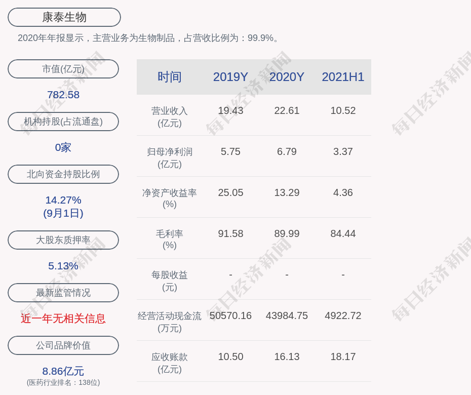 2020年年报显示,康泰生物的主营业务为生物制品,占营收比例为:99.9%。