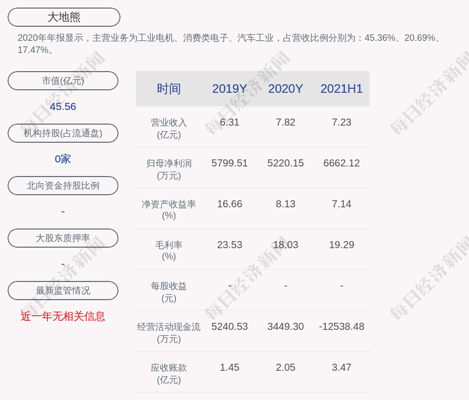 2020年年报显示,大地熊的主营业务为工业电机、消费类电子、汽车工业,占营收比例分别为:45.36%、20.69%、17.47%。