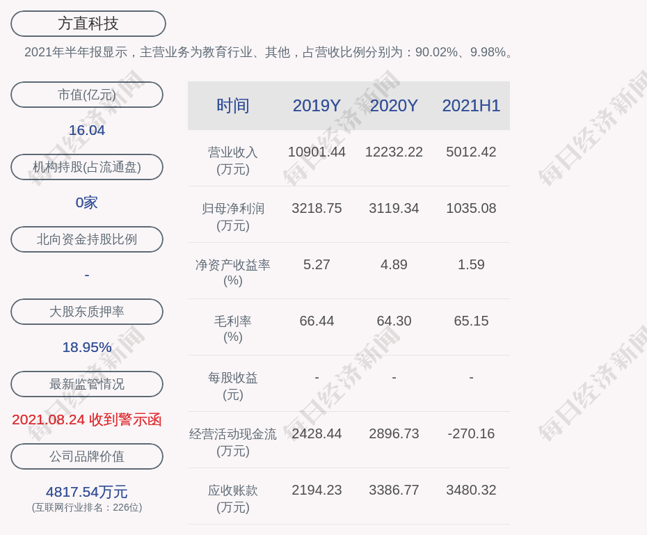 2021年半年报显示,方直科技的主营业务为教育行业、其他,占营收比例分别为:90.02%、9.98%。