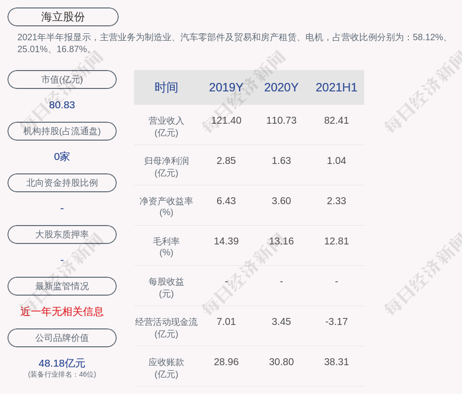 2021年半年报显示,海立股份的主营业务为制造业、汽车零部件及贸易和房产租赁、电机,占营收比例分别为:58.12%、25.01%、16.87%。