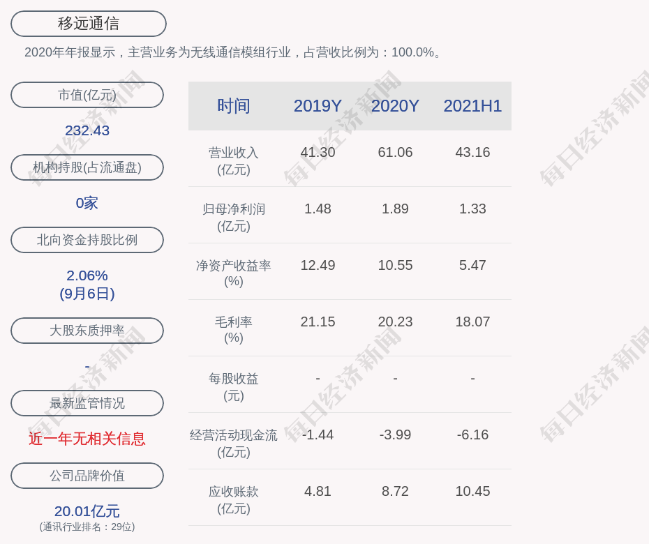 2020年年报显示,移远通信的主营业务为无线通信模组行业,占营收比例为:100.0%。