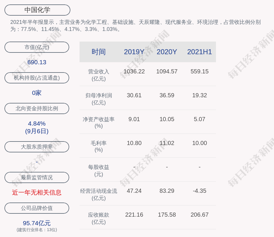2021年半年报显示,中国化学的主营业务为化学工程、基础设施、天辰耀隆、现代服务业、环境治理,占营收比例分别为:77.5%、11.45%、4.17%、3.3%、1.03%。