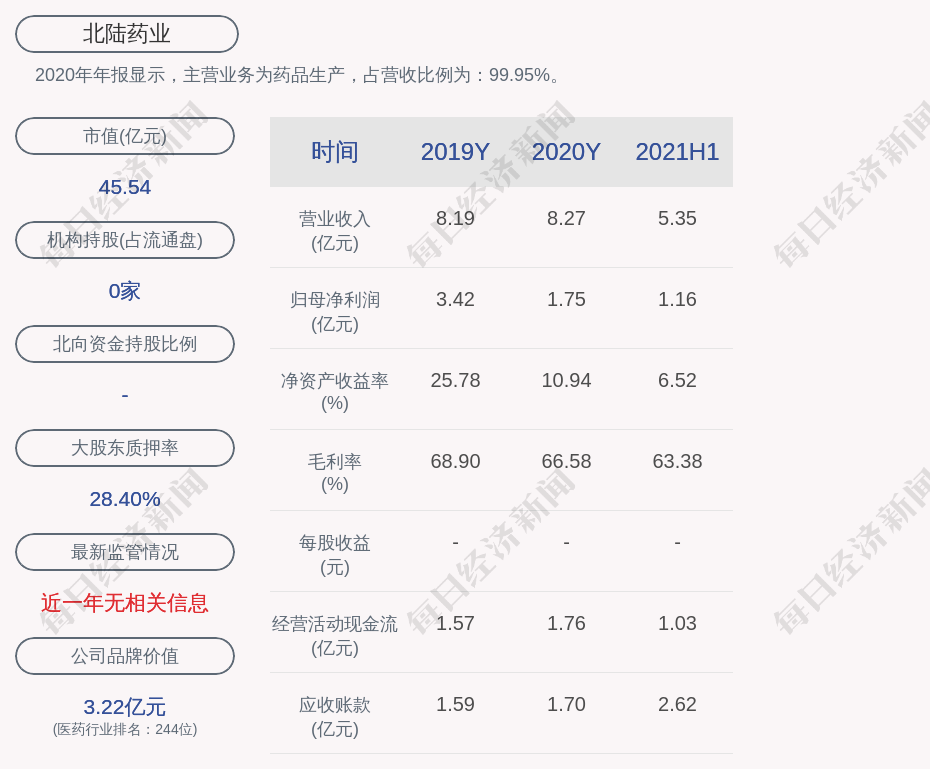 2020年年报显示,北陆药业的主营业务为药品生产,占营收比例为:99.95%。