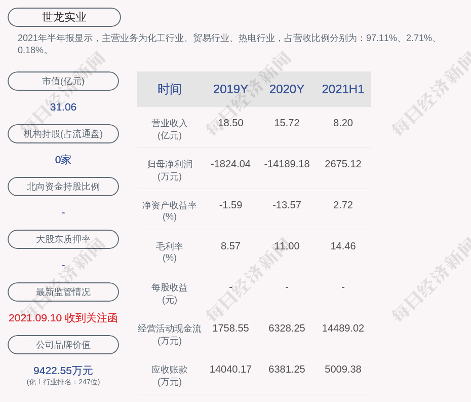 2021年半年报显示,世龙实业的主营业务为化工行业、贸易行业、热电行业,占营收比例分别为:97.11%、2.71%、0.18%。