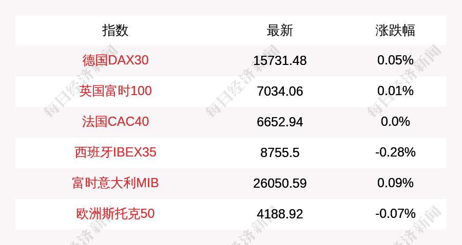 每经AI快讯:北京时间9月15日15:00,德国DAX30指数开盘上涨8.49点,涨幅为0.05%,报15731.48点;英国富时100指数开盘上涨0.55点,涨幅为0.01%,报7034.61点;法国CAC40指数平开,报6652.94点;西班牙IBEX35指数开盘下跌24.5点,跌幅为0.28%,报8755.5点;富时意大利MIB指数开盘上涨23.52点,涨幅为0.09%,报26050.59点;欧洲斯托克50指数开盘下跌2.75点,跌幅为0.07%,报4188.92点。