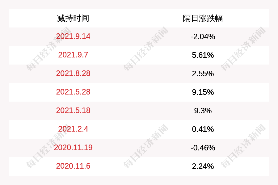 3. 华懋科技上次发布减持公告是2021年09月14日,第二个交易日下跌2.04%,华懋科技近一年共发布9次减持类公告。更多关键信息,请搜索“道达号”。