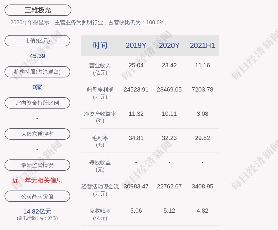 2020年年报显示,三雄极光的主营业务为照明行业,占营收比例为:100.0%。