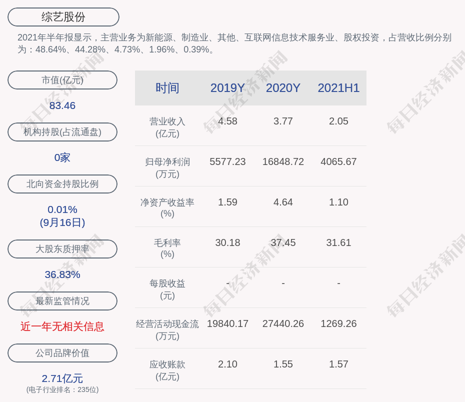 2021年半年报显示,综艺股份的主营业务为新能源、制造业、其他、互联网信息技术服务业、股权投资,占营收比例分别为:48.64%、44.28%、4.73%、1.96%、0.39%。