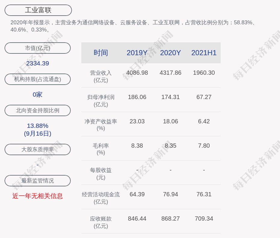 2020年年报显示,工业富联的主营业务为通信网络设备、云服务设备、工业互联网,占营收比例分别为:58.83%、40.6%、0.33%。