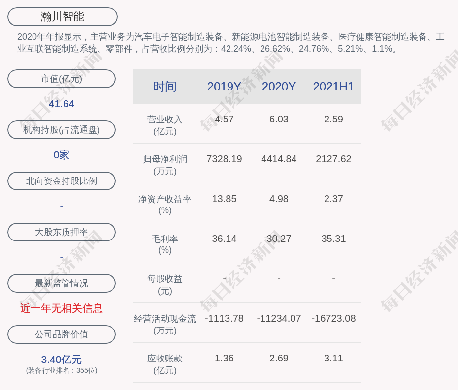 2020年年报显示,瀚川智能的主营业务为汽车电子智能制造装备、新能源电池智能制造装备、医疗健康智能制造装备、工业互联智能制造系统、零部件,占营收比例分别为:42.24%、26.62%、24.76%、5.21%、1.1%。