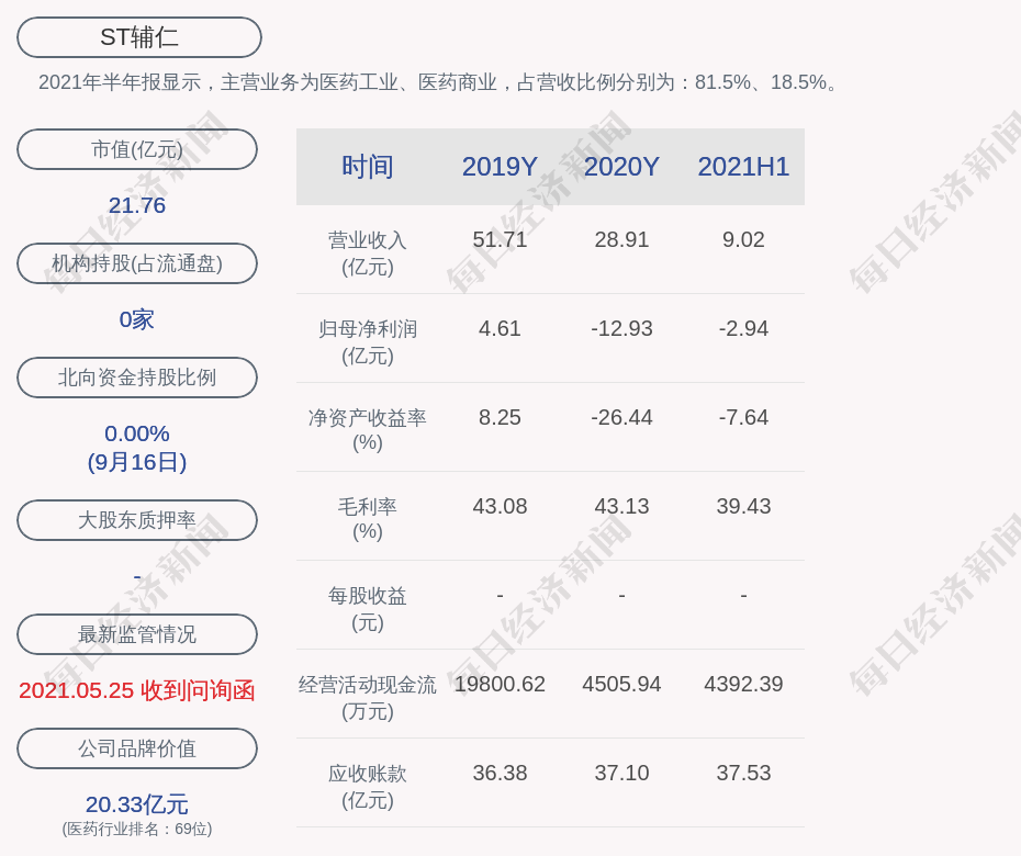 2021年半年报显示,ST辅仁的主营业务为医药工业、医药商业,占营收比例分别为:81.5%、18.5%。