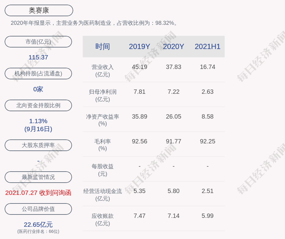 2020年年报显示,奥赛康的主营业务为医药制造业,占营收比例为:98.32%。