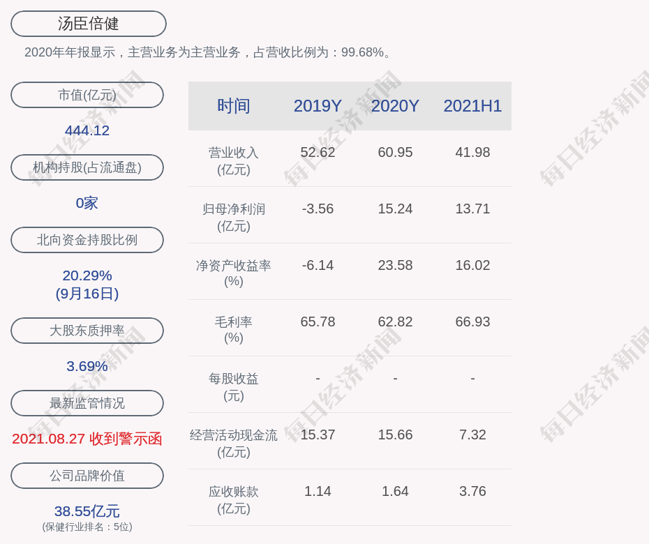 2020年年报显示,汤臣倍健的主营业务为主营业务,占营收比例为:99.68%。