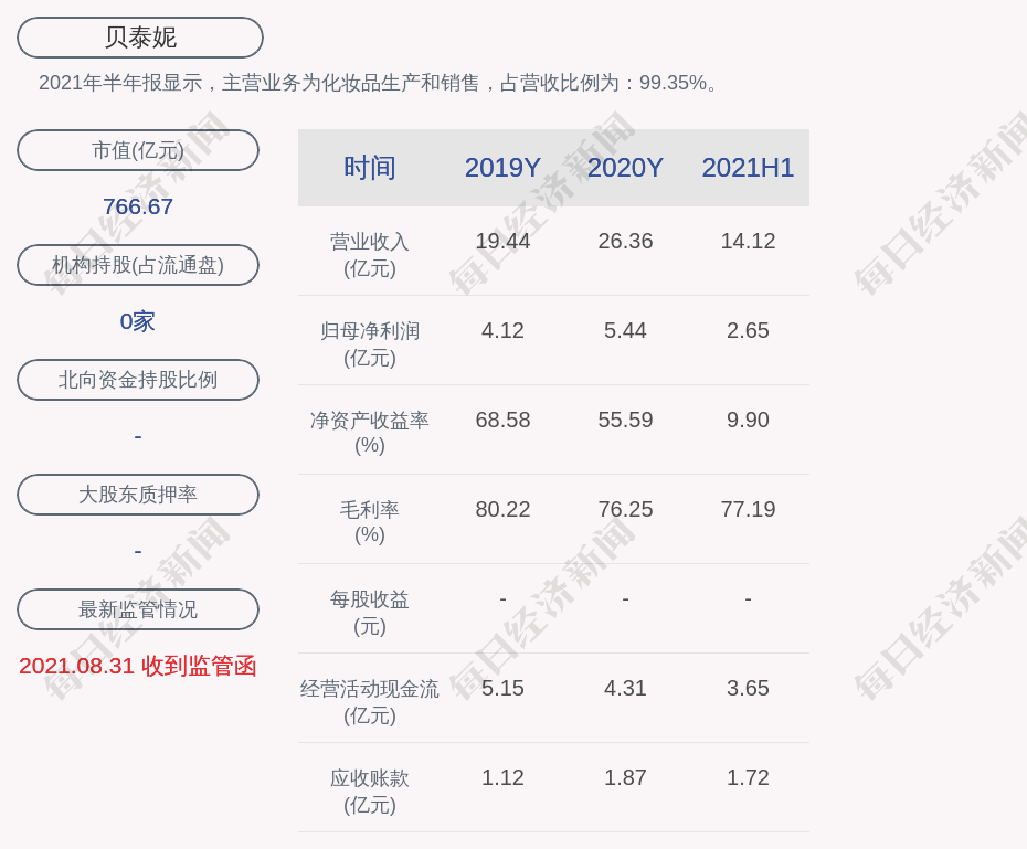 2021年半年报显示,贝泰妮的主营业务为化妆品生产和销售,占营收比例为:99.35%。