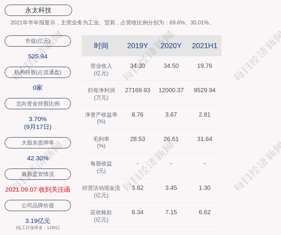 2021年半年报显示,永太科技的主营业务为工业、贸易,占营收比例分别为:69.6%、30.01%。