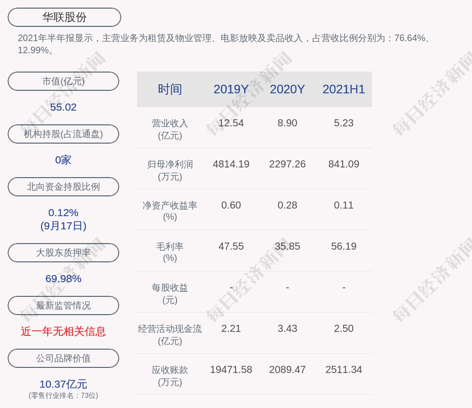 2021年半年报显示,华联股份的主营业务为租赁及物业管理、电影放映及卖品收入,占营收比例分别为:76.64%、12.99%。