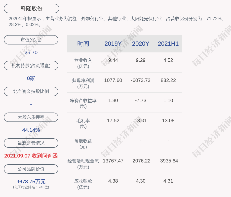 2020年年报显示,科隆股份的主营业务为混凝土外加剂行业、其他行业、太阳能光伏行业,占营收比例分别为:71.72%、28.2%、0.02%。