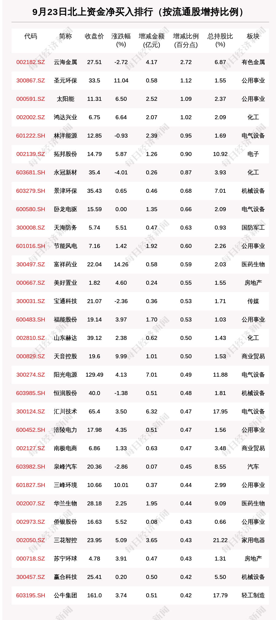 每经AI快讯,9月23日,北上资金净买入的个股共有737只,北上资金加仓比例超1%的有622只。其中,云海金属(002182.SZ,收盘价:27.51元)加仓比例最为明显,最新持股比例6.87%,环比增加2.72个百分点。其他北上资金加仓比例较多的个股还包括圣元环保(300867.SZ,收盘价:33.5元)、太阳能(000591.SZ,收盘价:11.31元)、鸿达兴业(002002.SZ,收盘价:6.75元)。
