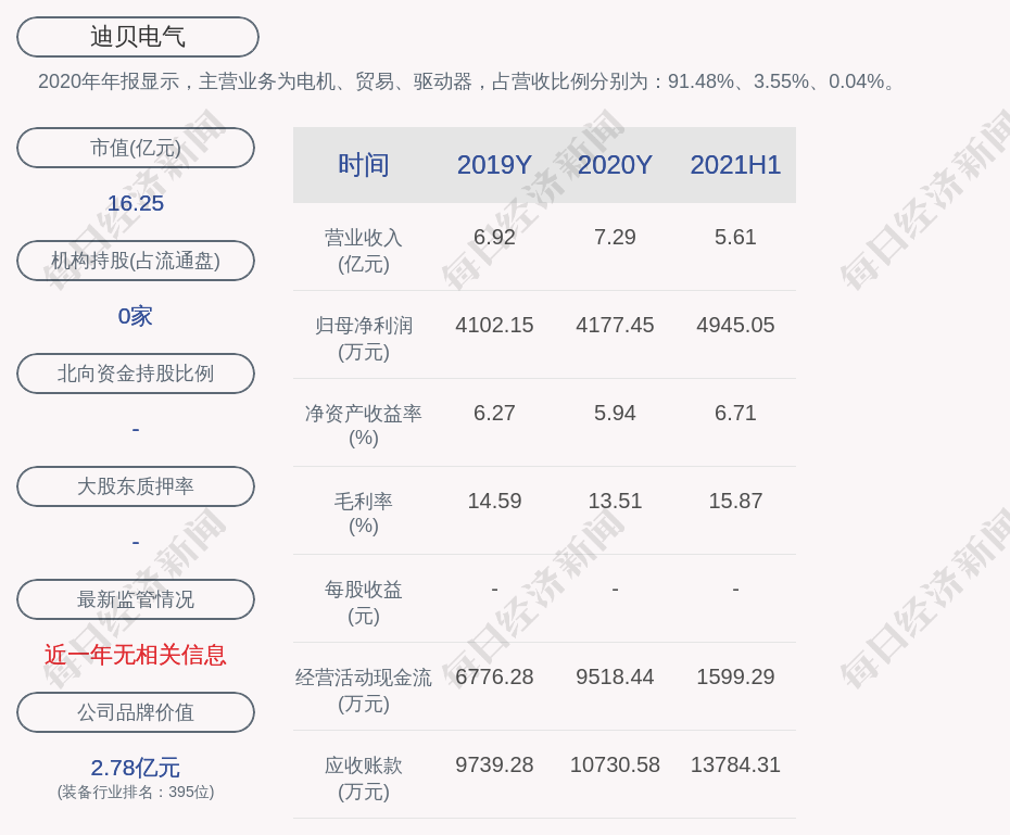 2020年年报显示,迪贝电气的主营业务为电机、贸易、驱动器,占营收比例分别为:91.48%、3.55%、0.04%。