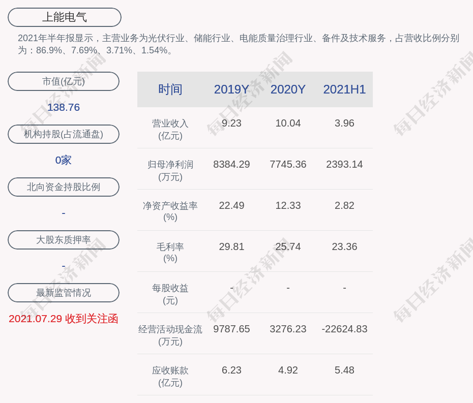 2021年半年报显示,上能电气的主营业务为光伏行业、储能行业、电能质量治理行业、备件及技术服务,占营收比例分别为:86.9%、7.69%、3.71%、1.54%。