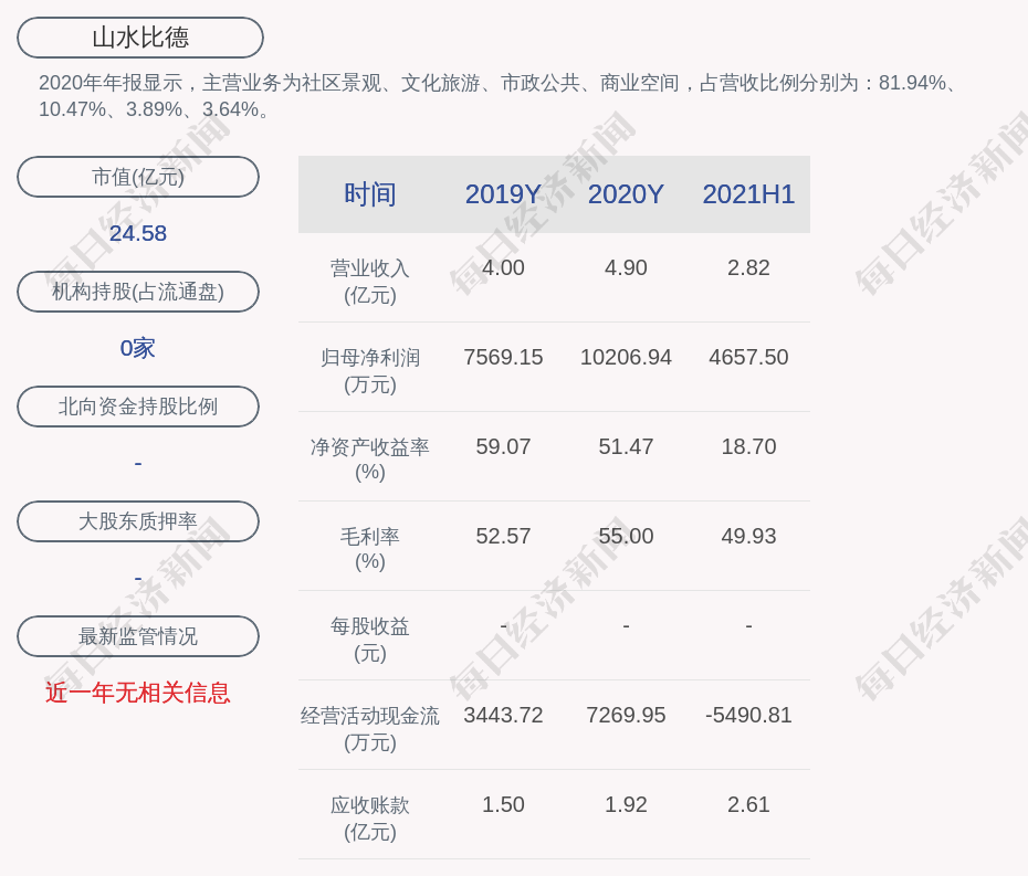 2020年年报显示,山水比德的主营业务为社区景观、文化旅游、市政公共、商业空间,占营收比例分别为:81.94%、10.47%、3.89%、3.64%。
