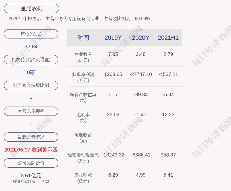 2020年年报显示,星光农机的主营业务为专用设备制造业,占营收比例为:96.99%。