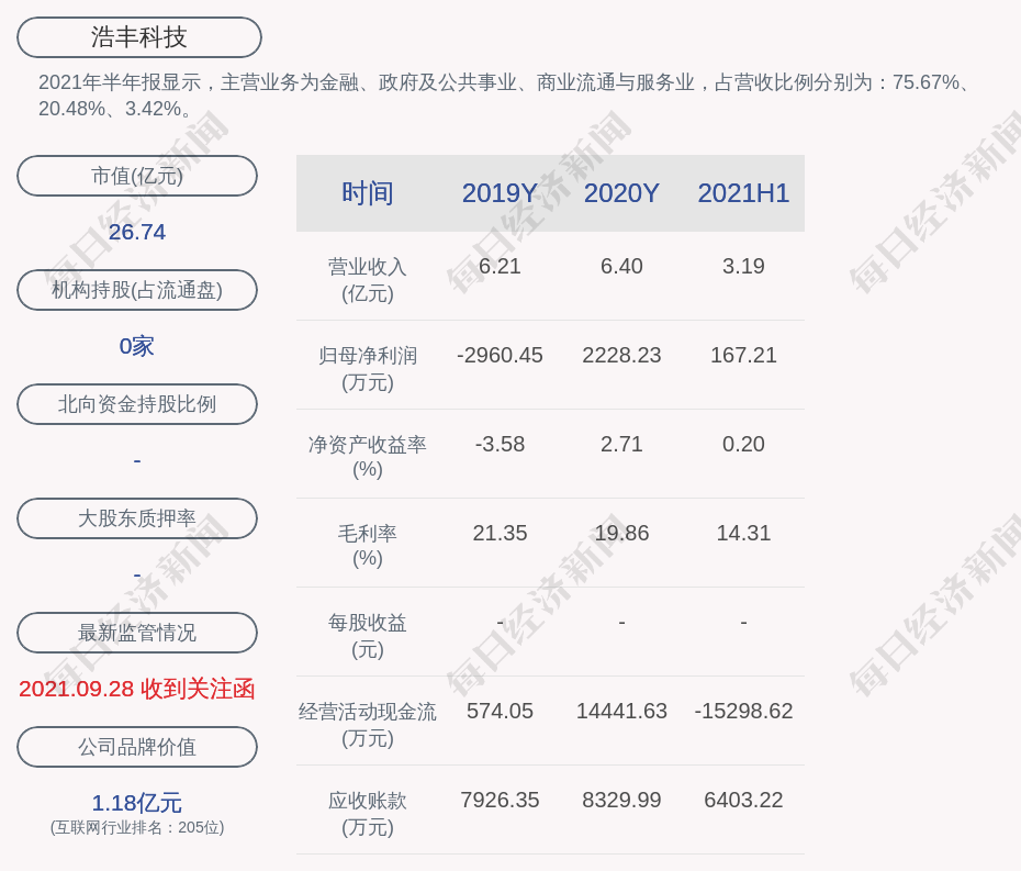 2021年半年报显示,浩丰科技的主营业务为金融、政府及公共事业、商业流通与服务业,占营收比例分别为:75.67%、20.48%、3.42%。