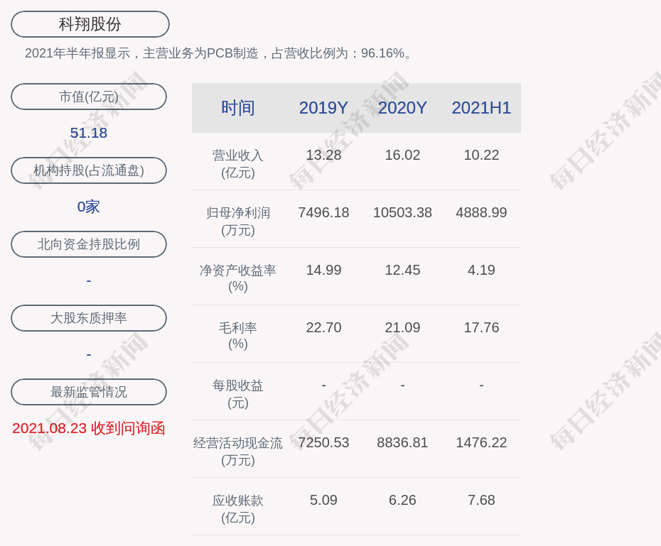 2021年半年报显示,科翔股份的主营业务为PCB制造,占营收比例为:96.16%。