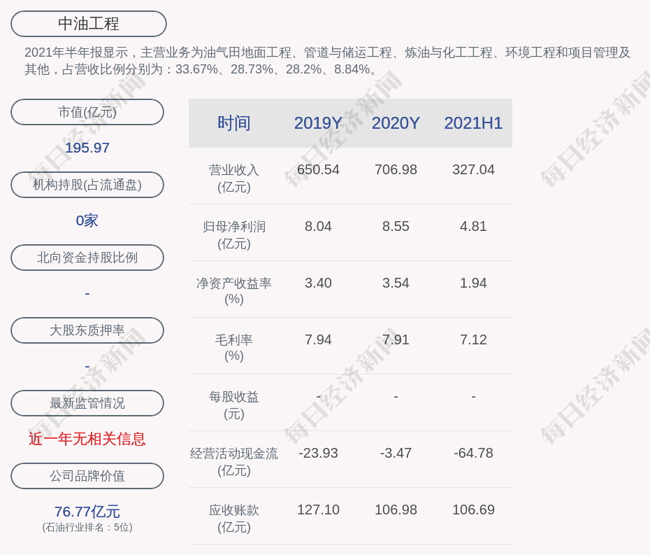 2021年半年报显示,中油工程的主营业务为油气田地面工程、管道与储运工程、炼油与化工工程、环境工程和项目管理及其他,占营收比例分别为:33.67%、28.73%、28.2%、8.84%。