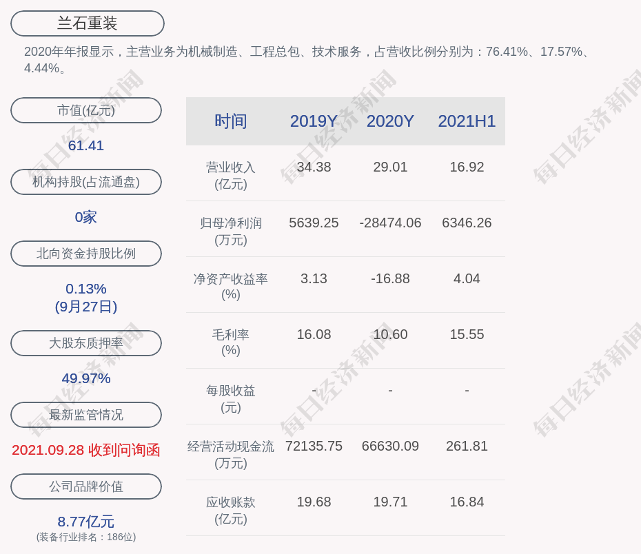 每经AI快讯,2021年9月28日,上交所向兰石重装(SH 603169,收盘价:5.84元)发出问询函:2021年9月28日,你公司披露公告,拟以现金1.29亿元收购秦皇岛金核投资有限公司(以下简称金核投资)持有的中核嘉华设备制造股份公司(以下简称标的公司)55%股权。针对“公告显示,标的公司主要从事核安全设备制造等业务,截至2020年末净资产为7258.13万元,2018至2020年分别实现收入1.04亿元、0.96亿元、0.91亿元,实现净利润230.65万元、100.22万元、135.17万元。本次交易中标的公司按照收益法评估的价值为2.49亿元,评估增值率243.13%。”等情况,上交所提出包括“补充披露标的公司最近三年一期的主要客户及供应商情况,说明标的公司与其是否存在关联关系或其他特殊约定,是否对其存在较大依赖,如是,请充分提示风险。”等要求。
