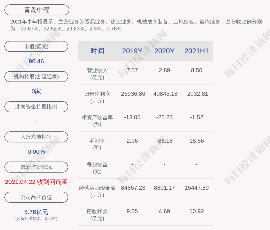 2021年半年报显示,青岛中程的主营业务为贸易业务、建造业务、机械成套装备、土地出租、咨询服务,占营收比例分别为:33.67%、32.52%、29.83%、2.3%、0.76%。