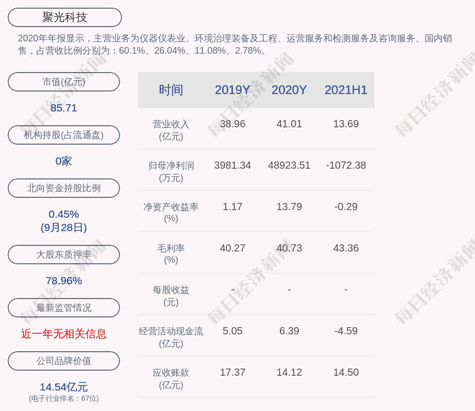 2020年年报显示,聚光科技的主营业务为仪器仪表业、环境治理装备及工程、运营服务和检测服务及咨询服务、国内销售,占营收比例分别为:60.1%、26.04%、11.08%、2.78%。
