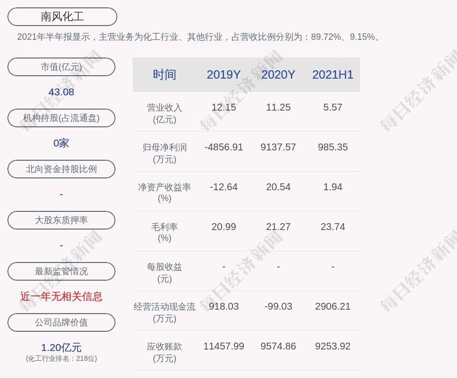 2021年半年报显示,南风化工的主营业务为化工行业、其他行业,占营收比例分别为:89.72%、9.15%。