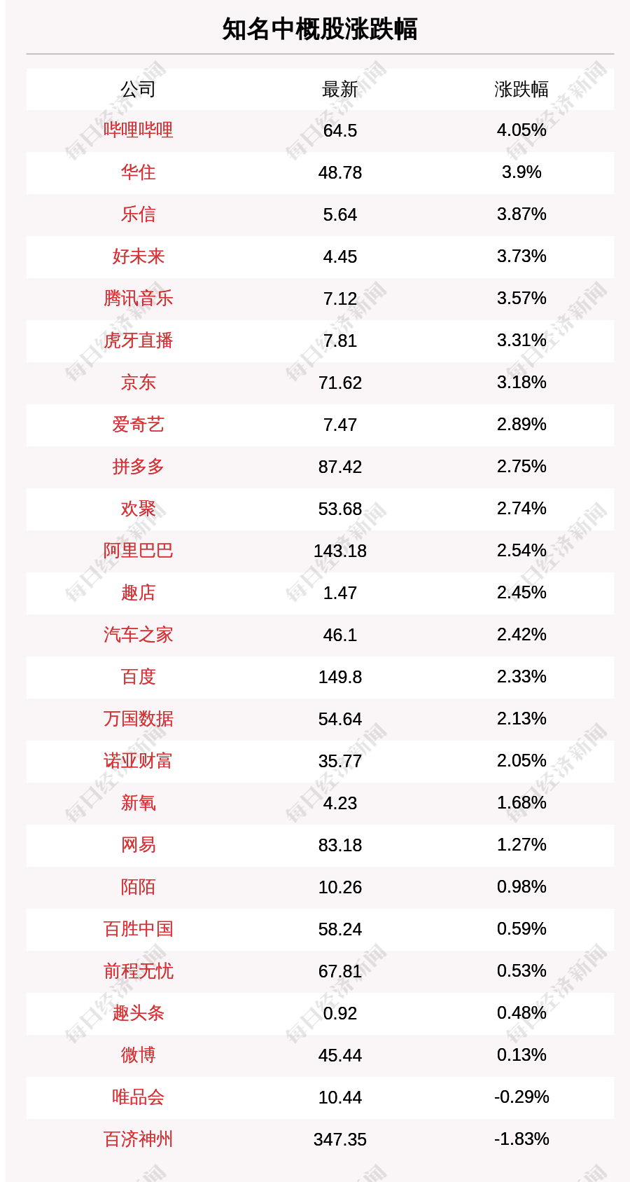 每经AI快讯:北京时间10月6日04:00,知名中概股中哔哩哔哩、华住、乐信、好未来、腾讯音乐涨幅居前,收盘分别上涨4.05%、3.9%、3.87%、3.73%、3.57%。百济神州、唯品会跌幅居前,收盘分别下跌1.83%、0.29%。
