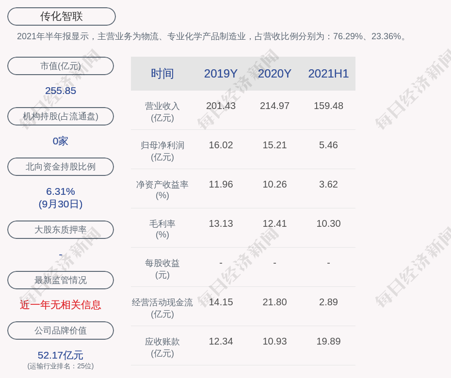 2021年半年报显示,传化智联的主营业务为物流、专业化学产品制造业,占营收比例分别为:76.29%、23.36%。