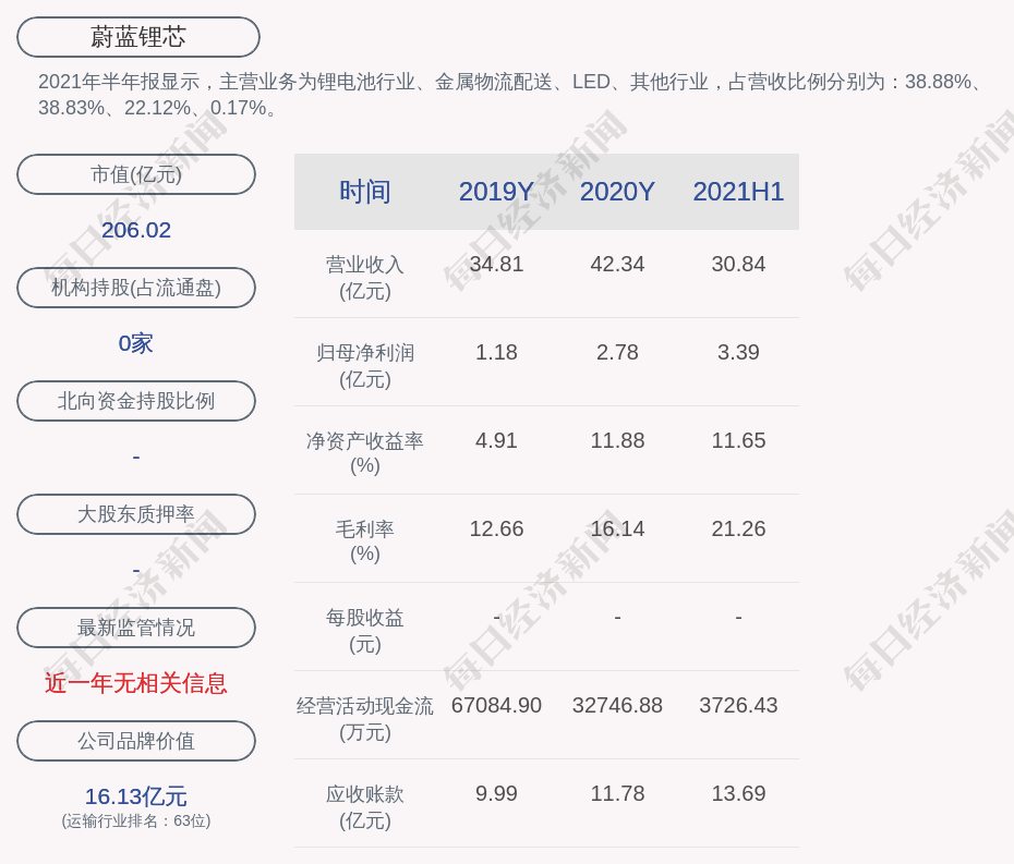 2021年半年报显示,蔚蓝锂芯的主营业务为锂电池行业、金属物流配送、LED、其他行业,占营收比例分别为:38.88%、38.83%、22.12%、0.17%。