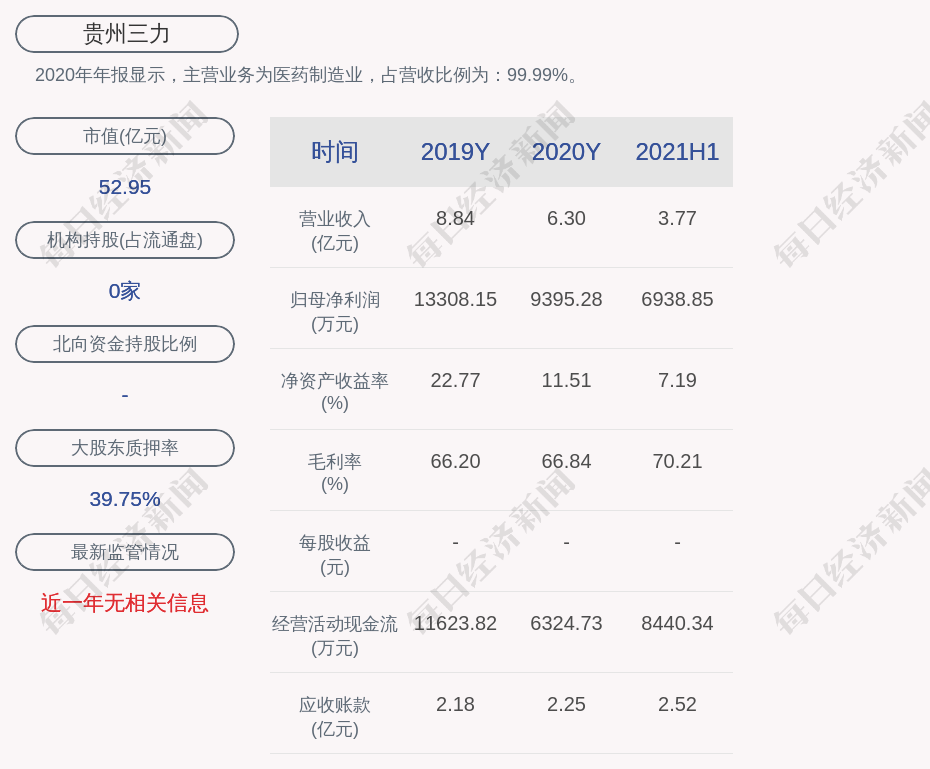 2020年年报显示,贵州三力的主营业务为医药制造业,占营收比例为:99.99%。