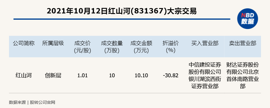 2021年10月12日,新三板创新层公司红山河(831367)发生一笔大宗交易,成交价1.01元/股,成交数量10万股,成交金额10.10万元,折价30.82% 。买入营业部是中信建投证券股份有限公司银川湖滨西街证券营业部,卖出营业部是财达证券股份有限公司北京首体南路营业部。