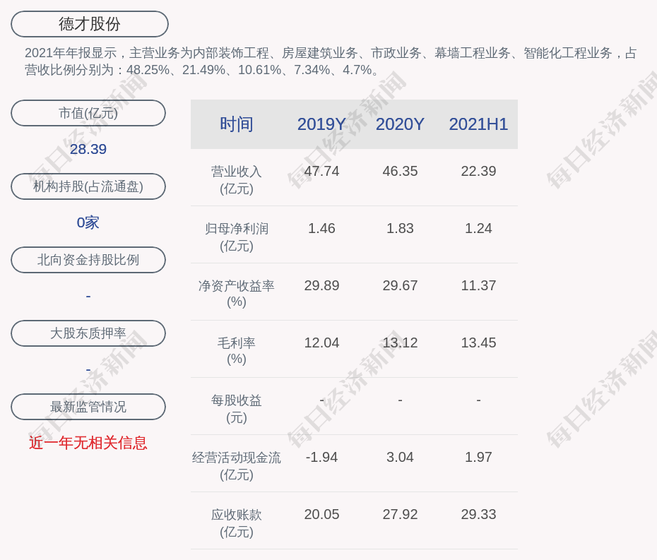 2021年年报显示,德才股份的主营业务为内部装饰工程、房屋建筑业务、市政业务、幕墙工程业务、智能化工程业务,占营收比例分别为:48.25%、21.49%、10.61%、7.34%、4.7%。