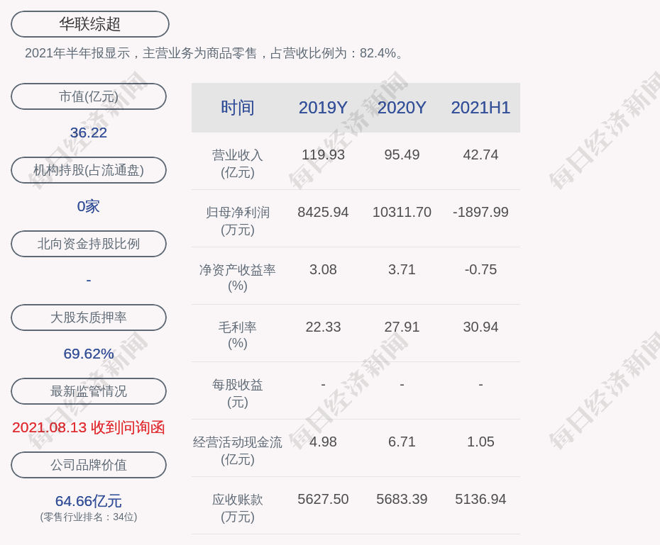 2021年半年报显示,华联综超的主营业务为商品零售,占营收比例为:82.4%。