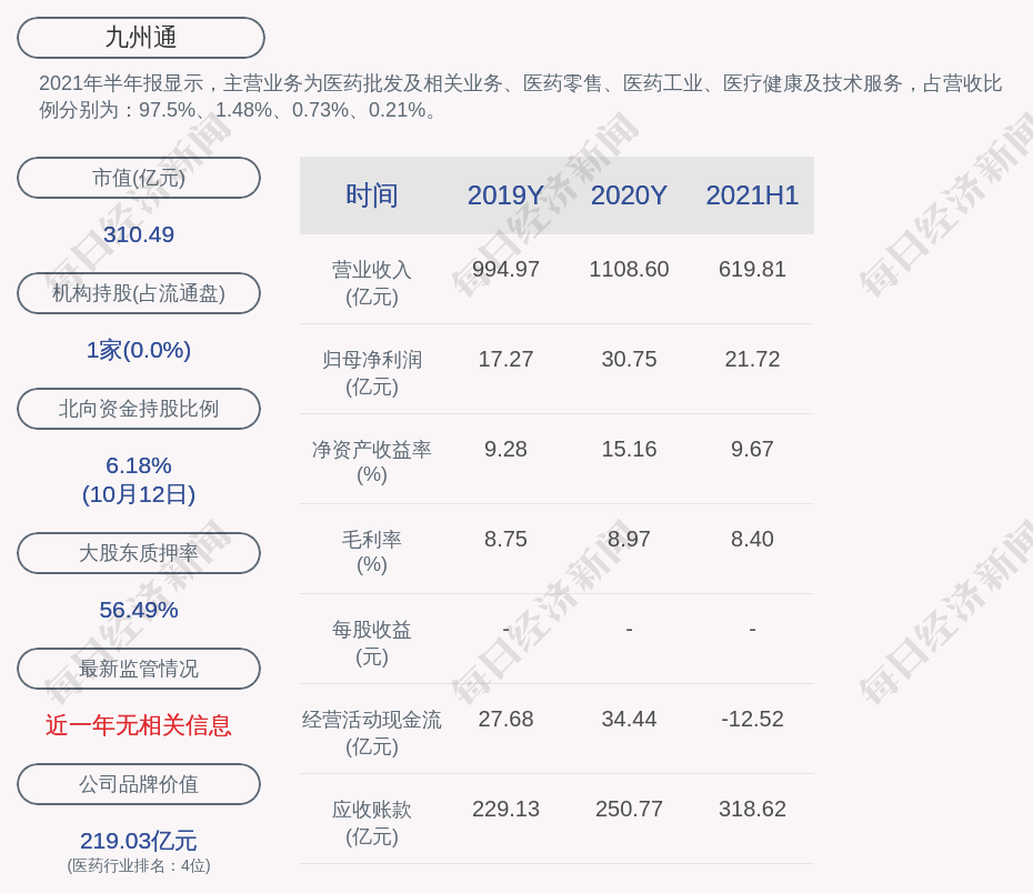 2021年半年报显示,九州通的主营业务为医药批发及相关业务、医药零售、医药工业、医疗健康及技术服务,占营收比例分别为:97.5%、1.48%、0.73%、0.21%。