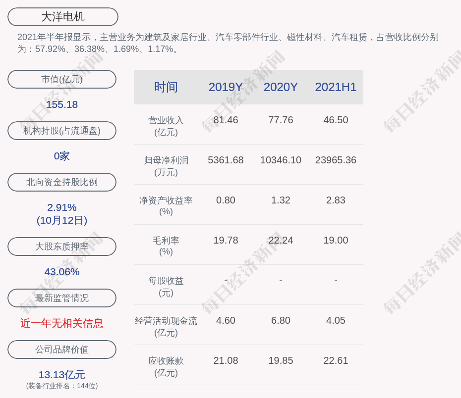 2021年半年报显示,大洋电机的主营业务为建筑及家居行业、汽车零部件行业、磁性材料、汽车租赁,占营收比例分别为:57.92%、36.38%、1.69%、1.17%。