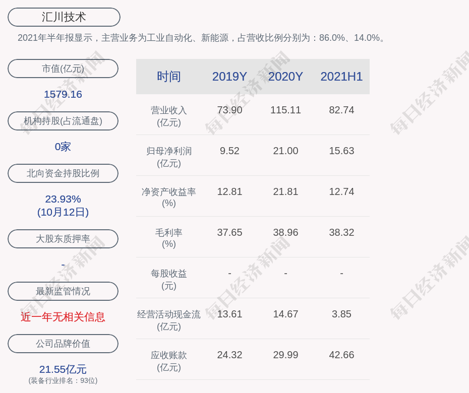 2021年半年报显示,汇川技术的主营业务为工业自动化、新能源,占营收比例分别为:86.0%、14.0%。