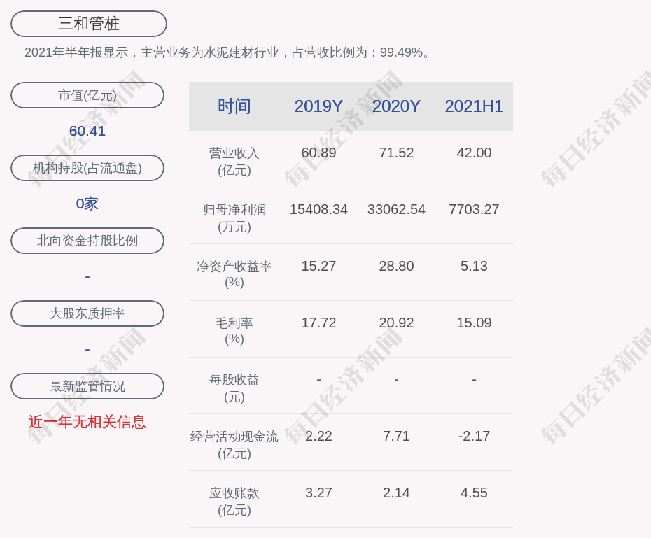 2021年半年报显示,三和管桩的主营业务为水泥建材行业,占营收比例为:99.49%。