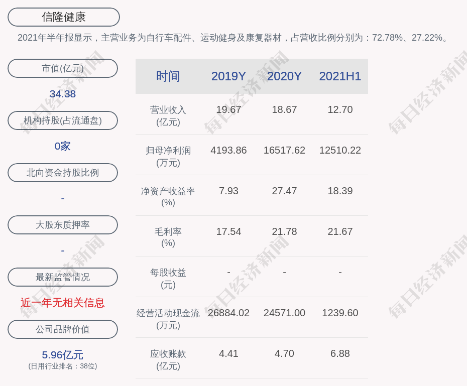 2021年半年报显示,信隆健康的主营业务为自行车配件、运动健身及康复器材,占营收比例分别为:72.78%、27.22%。