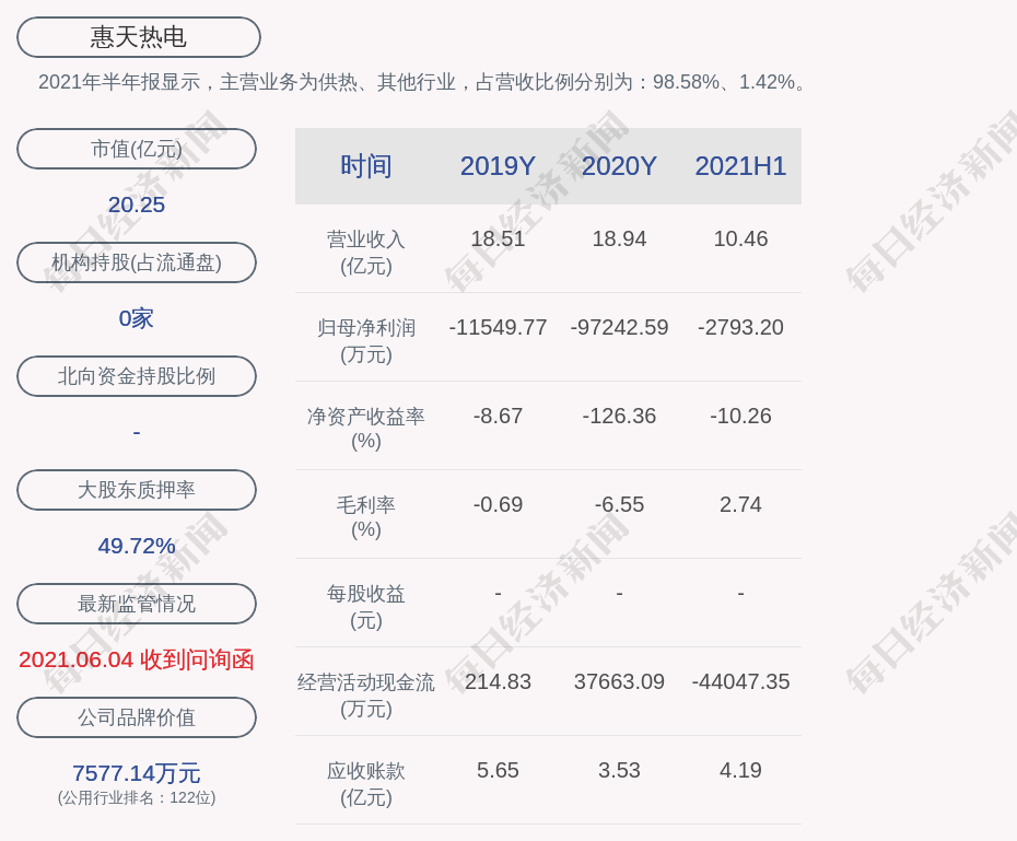 2021年半年报显示,惠天热电的主营业务为供热、其他行业,占营收比例分别为:98.58%、1.42%。
